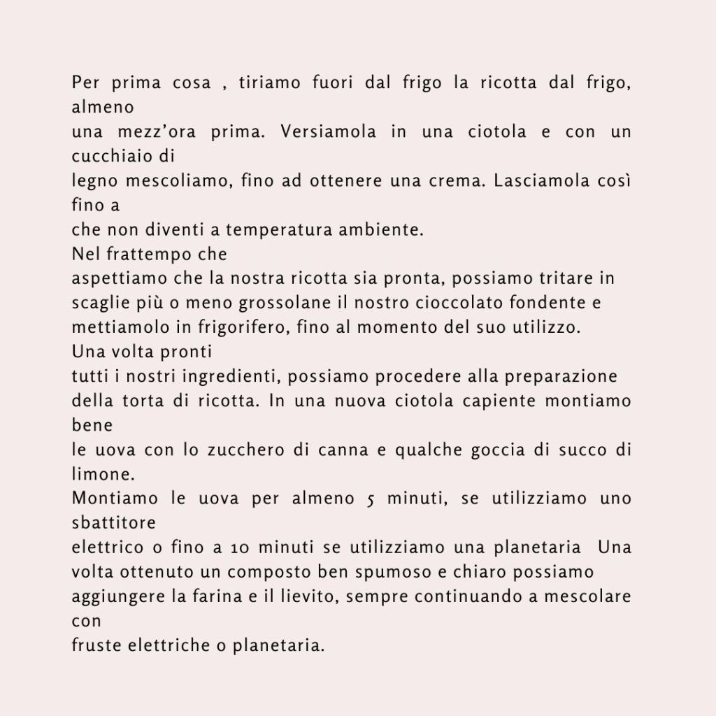 - ricotta ridotta in crema, semplicemente mescolando il formaggio con un cucchiaio di legno . Ma cosa importante, aggiungere la ricotta all’impasto solo una volta che si presenti a temperatura ambiente ( quindi al tatto non si presenti fredda di frigo)