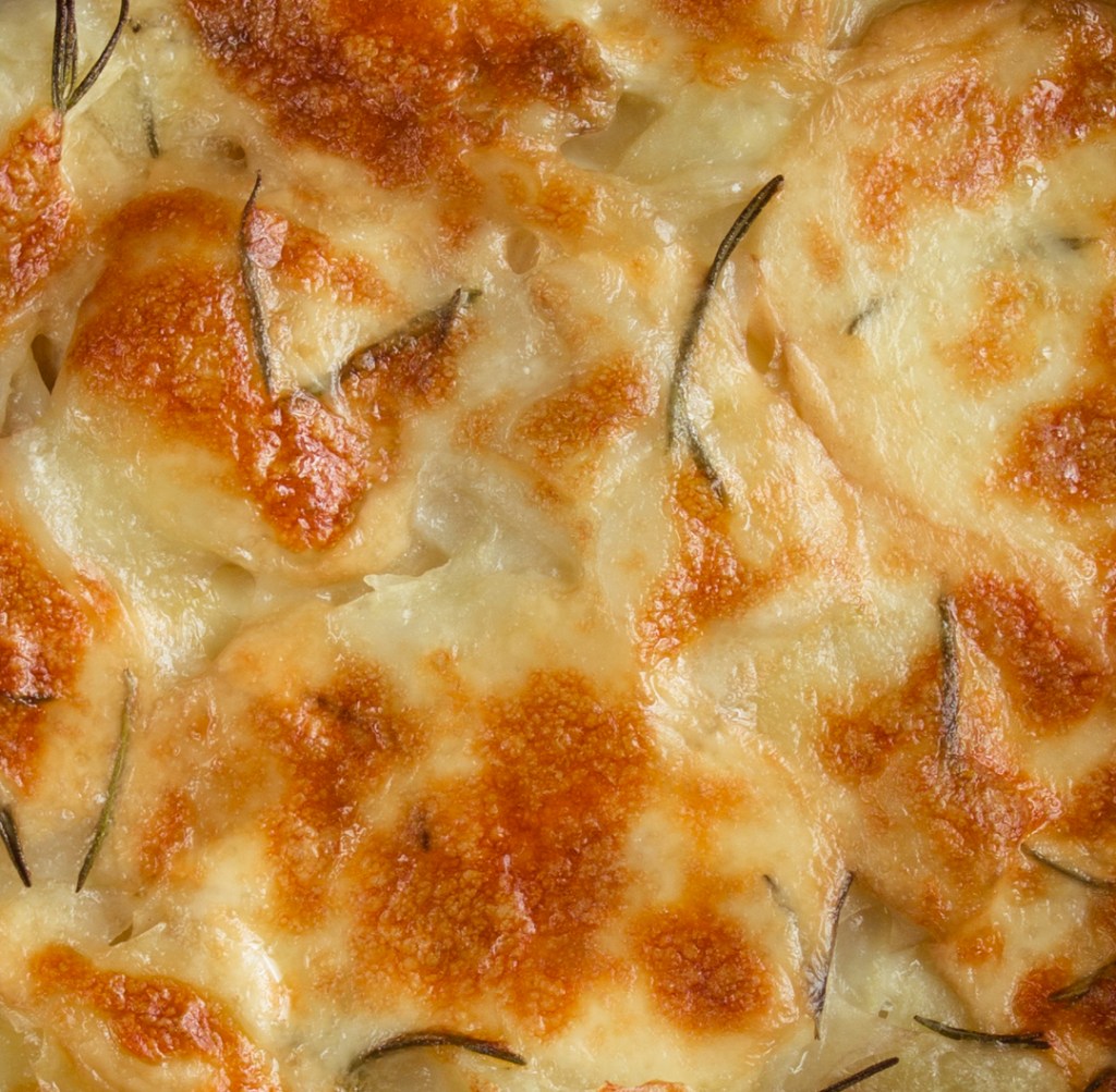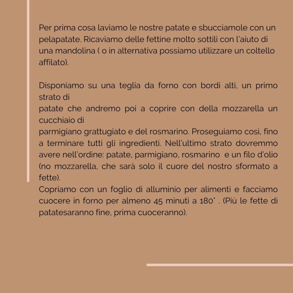 ” Per le sere di Primavera, quelle fatte di ticchettii di pioggia sul vetro della finestra. Quelle con le leggere folate di vento, a ricordare quanto è bello coprirsi le spalle con un cardigan leggero bianco di pizzo san gallo. Quelle perfette, dove un bel bicchiere di vino bianco frizzantino ne fa da contorno; dove dalla televisione non escono altre che belle notizie sommesse. Dove per una sera, almeno, i pensieri sono strigati come i capelli appena lavati. Sono in ordine e profumati, in ogni cassetto della tua piccola mente e per una volta saranno dormienti e non usciranno a chiedere delucidazioni. La sera perfetta per coccolarsi con qualcosa di buono, che sappia di conforto. Che ci abbracci le papille gustative, che ci inebrii con il suo profumo di rosmarino. Un cuore goloso e filante, per riscoprire tutta la bontà di uno sformato di patate, forchettata dopo forchettata.”