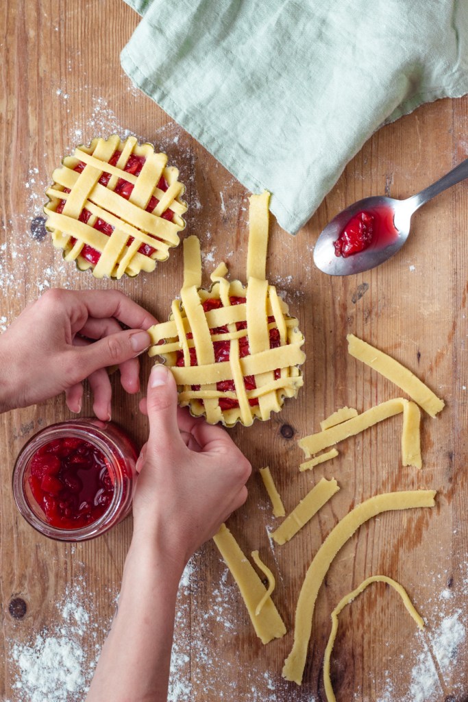 *Aumentando il numero di strisce,con lo stesso schema, potrete coprire benissimo anche una crostata grande anzichè delle crostatine.