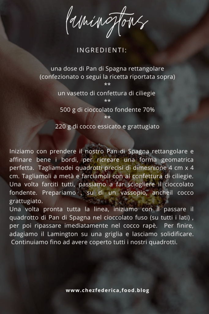 Se anche tu , sotto mio consiglio, sceglierai quella di ciliegie potrai benissimo spalmarne una confezionata oppure , se ti va, puoi cimentarti nella preparazione di essa. Ti basterà seguire questa ricetta e dividere le dosi a metà per ottenere un vasetto di confettura ( il quantitativo esatto per questi Lamingtons). Qui, per la preparazione.