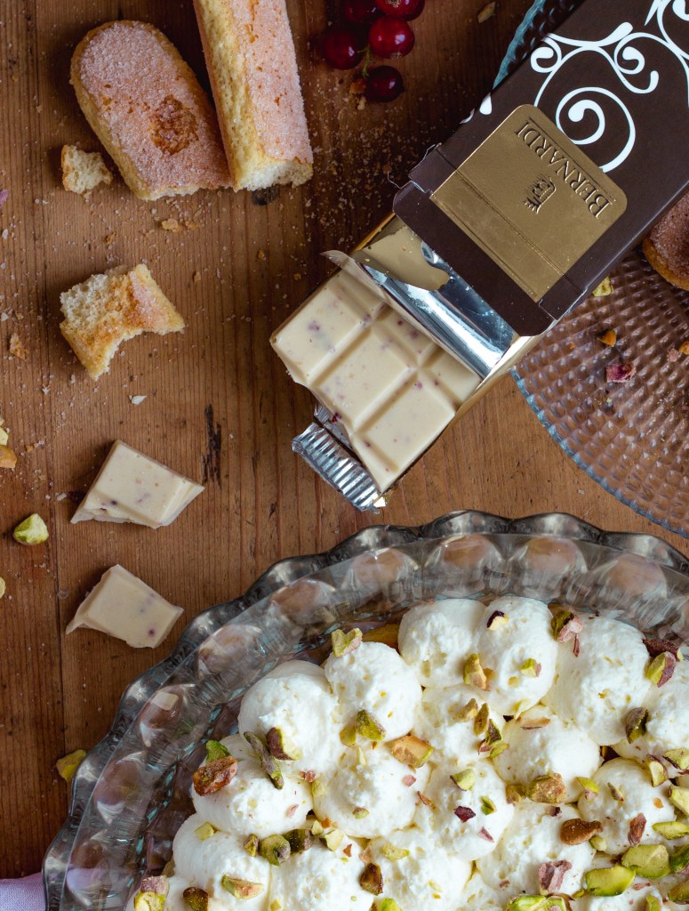 Una volta pronti i vari ingredienti, passsiamo alla composizione del dolce. Prendiamo una ciotola di medie dimensioni e creiamo un primo strato di savoiardi bagnati. Versiamo uno strato di crema, i pistacchi in granella e completiamo con i futti rossi. Continuiamo con questi strati fino al termini di ogni ingrediente. Nell’ultimo strato, dopo aver completato con abbondante frutti rossi, doniamo quel tocco in più al dolce con piccole scaglie di cioccolato bianco ai frutti di rossi Bernardi Cioccolato . Facciamo riposare il tiramisù in frigorifero fino al momento di servirlo in tavola.