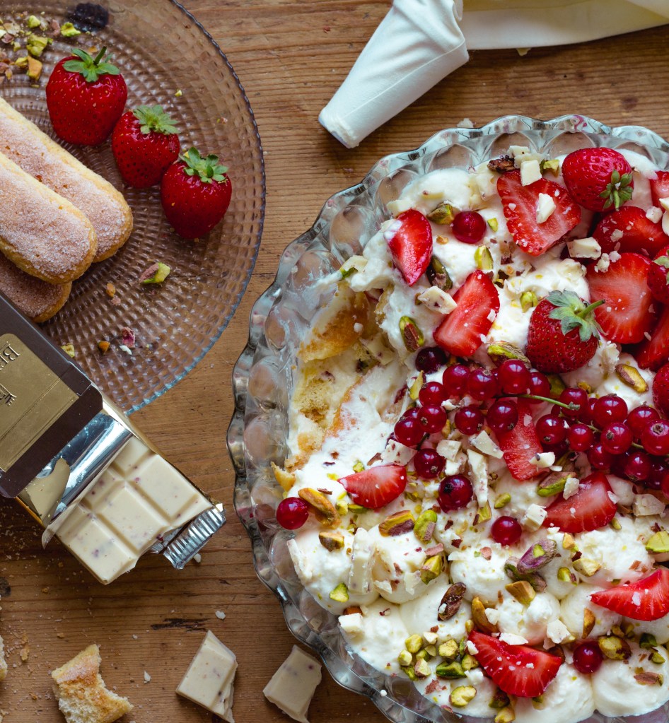 La mia versione prevede Savoiardi inzuppati in una bagna leggera di limoncello. Un frosting di mascarpone al cioccolato bianco, impreziosito tra uno strato e l’altro da tanta frutta a pezzi.