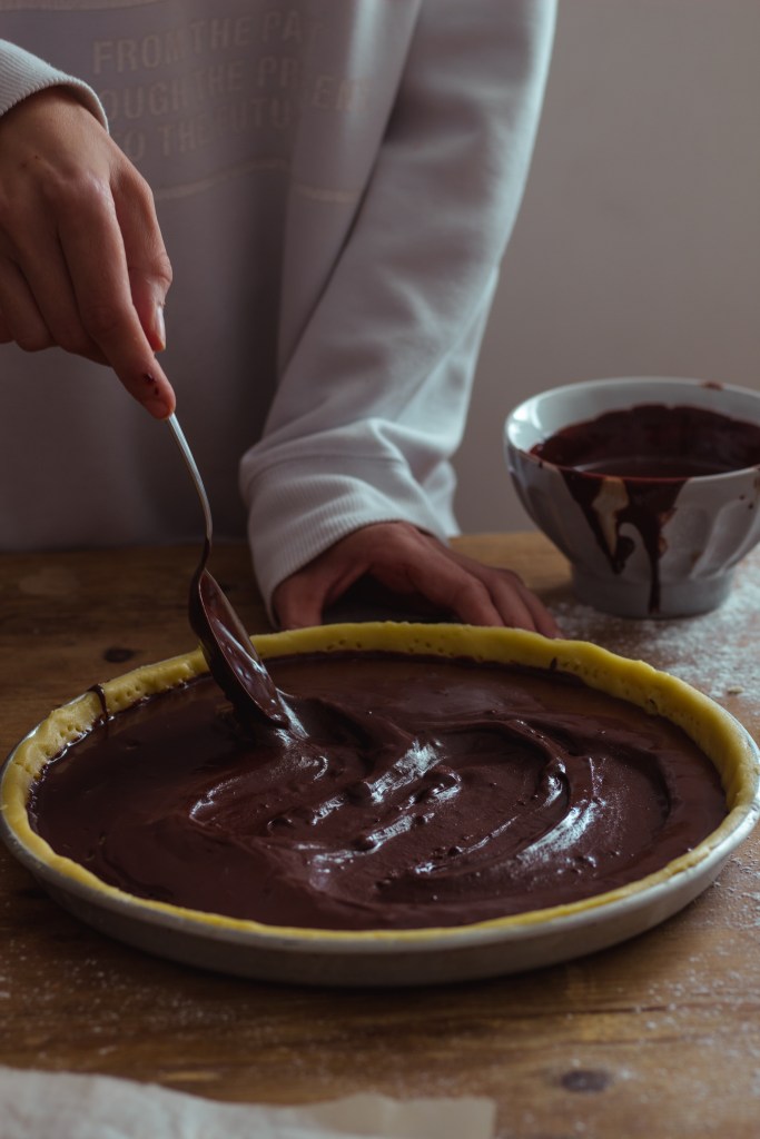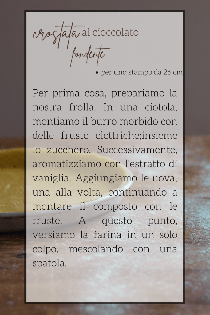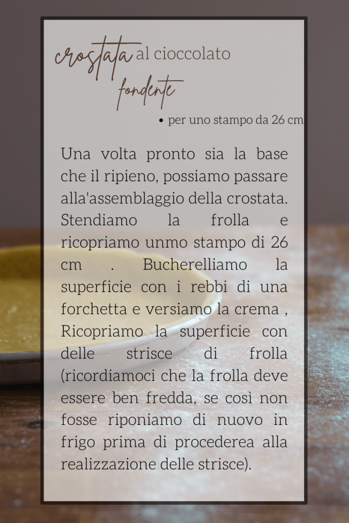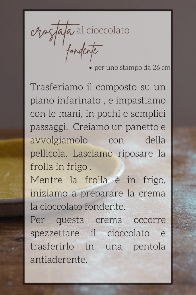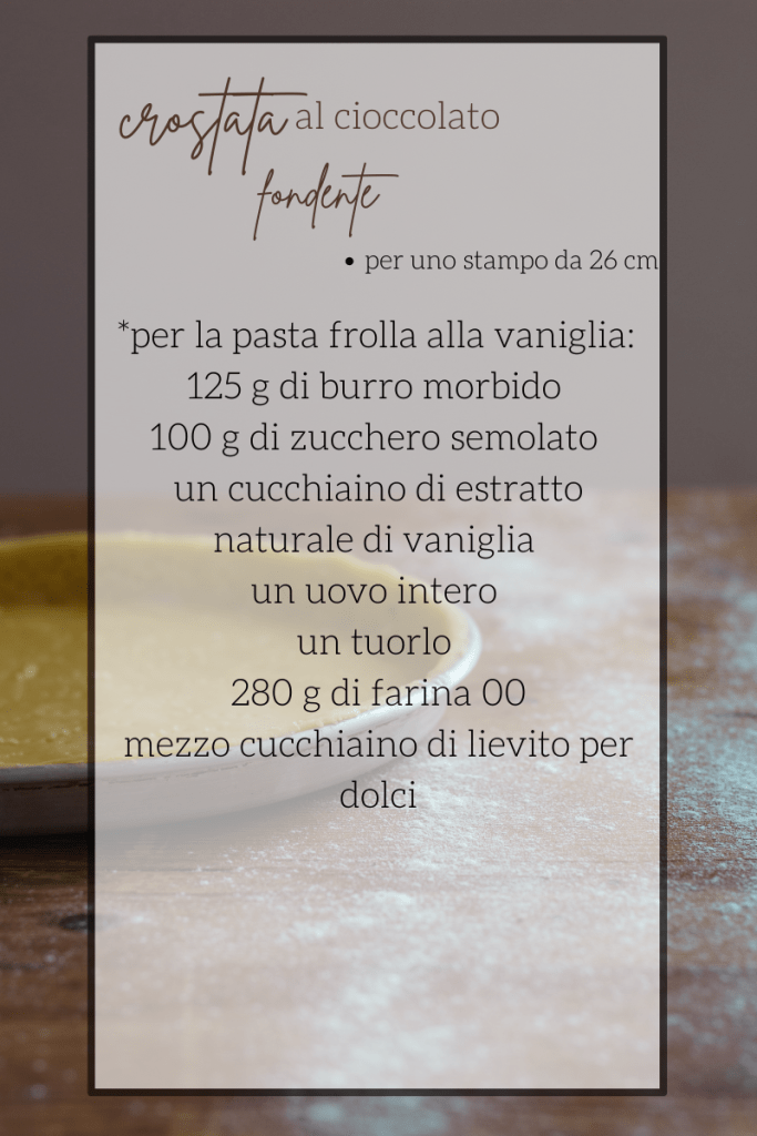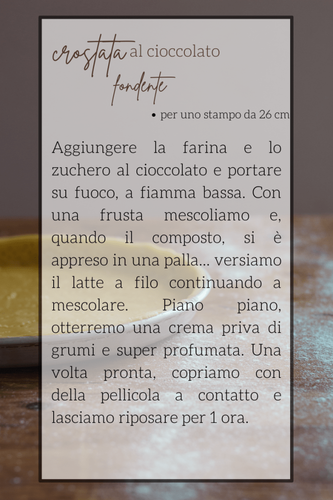 una crema -fondentissima- farcisce questa golosa frolla al burro. Per concedersi questa piccola coccola occorrerà semplicemente acquistare una tavoletta di cioccolato fondente ( dal 70% in su) , spezzettarla e portarla su fuoco con zucchero, farina e latte. Lasciare raffreddare , per poi lasciarvi coccolare da questa morbida crema… anche a cucchiaiate! 😉