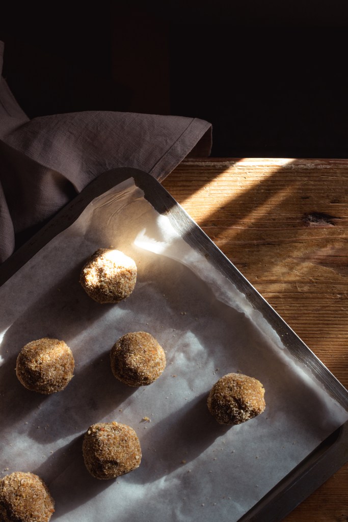 Successivamente, pensiamo a formare le polpettine , prelevando un cucchiao di impasto e tuffandolo nel pangrattato. Con estrema attenzione (visto che l’impasto che abbiamo ottenuto risulterà molto morbido) diamo la forma di polpetta e trasferiamo su una teglia ricoperta da carta forno . Continuiamo fino al termine di tutti gli ingredienti. Cospargiamo con un filo di olio e facciamo cuocere in forno preriscaldato a 180 ° per circa 20 minuti. Le polpette sono pronte quando noteremo la superficie ben croccante.