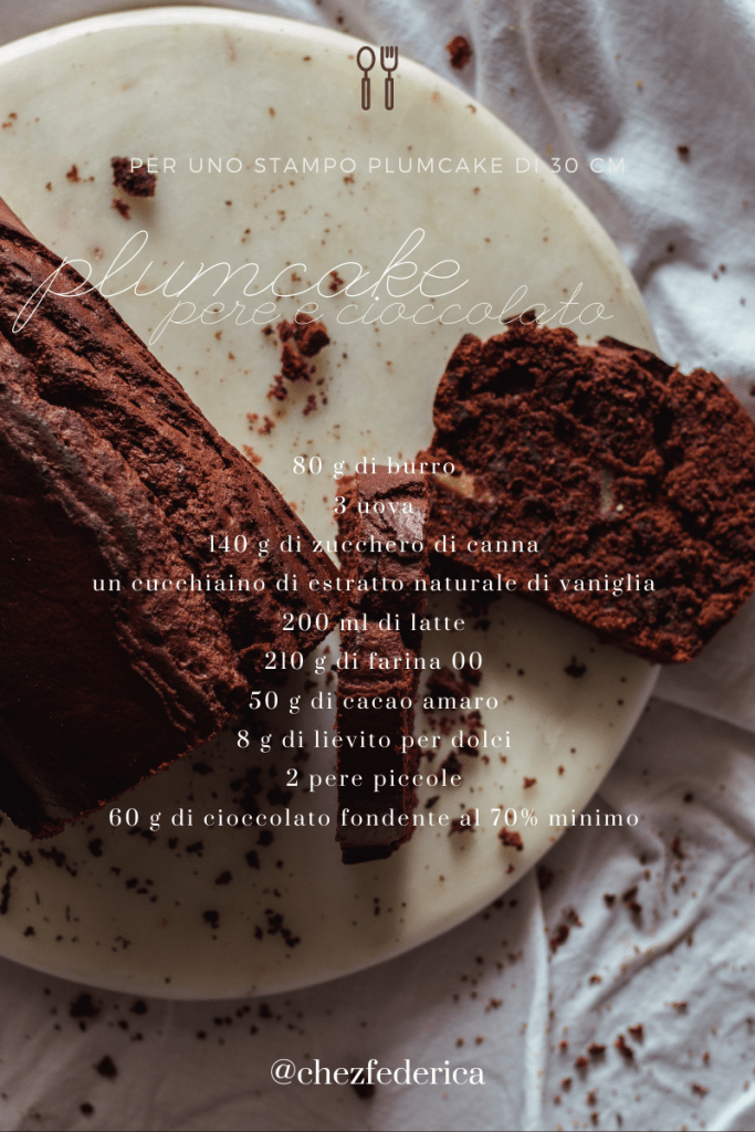 Ho bisogni di staccare. Di fermare questo tempo , che in fretta se ne va. Ma davvero siamo gia al 22 di Ottobre?! E tutte le ricette che voglio cucinare con la zucca? Dove le metto?! Giorni che si contano su dita di due mani prima che un nuovo vento e un nuovo mese entri prepotente nelle nostre cucine. Vi capita mai di ritrovarvi in questo modo?! Con un pugno di “vorrei” in una mano?! Saranno le mie doti disorganizzative a farmi ritrovare così… demoralizzata in queste giornate grigie. Avete delle soluzioni? L’unica cura che io conosco è quella di fermarmi. Mettermi sul tavolo grande di legno e battere alla tastiera pensieri confusi che si alternano a dosi di ricette. Poi, naturalmente, prendere tutto quello che ho trascritto e portarlo con me in cucina. Dove tiro fuori, dalla dispensa, vaniglia e cioccolato. Le ultime pere , di questa pazza e fredda stagione e il cacao amaro. Ho un nuovo stampo da provare . Una fetta di plumcake, non me lo toglie nessuno. Poi, è una vera magia quando si accompagna con del caffè bero, lungo e amaro. La mia ricetta per la merenda perfetta. Per la pausa golosa. Per sedersi di nuovo con i mille pensieri e, questa volta, una pagina bianca in cui poterli trascrivere.